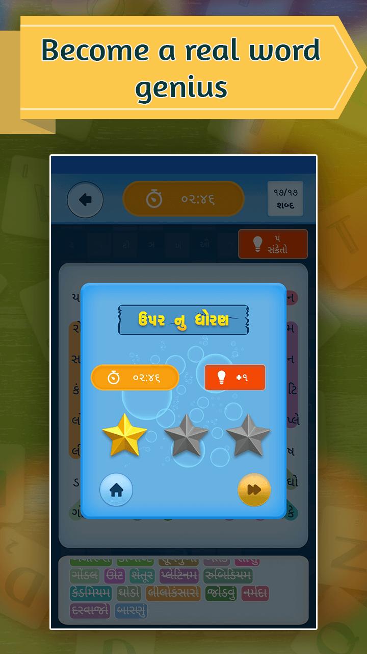 Search all the hidden words in this word search game in Gujarati app. Word search for kids in Gujarati consists of 9 categories like All word, Animals, Cars, Birds, Flower, Fruit, Noun, Elements, and Countries. Time is a key here, you have to constantly monitor the time and finish the game with minimum time. If you successfully clear the level with the minimum amount of time then you'll be rewarded with hints according to the start you've earned. The more stars you earn the more hints you'll get in word games in Gujarati app.